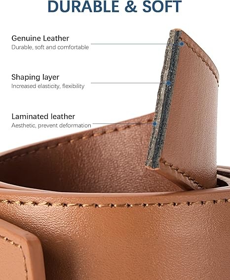 Easy to Use: Loosen and tighten as needed in a second. Just slide the belt into the buckle and pull the leather belt through, the buckle simply auto locks the belt, releasing the buckle by simply shifting the small lever. Cuttable Design: Do You always had issues with belt buckles digging into and always being too big or too small? this leather belt for men come with a long leather belt strap that has lines and sizes so you can cut for optimum length.