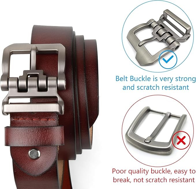 Real Material : These Belts for men are made of Genuine cowhide, which are strong and durable. The fashion style design buckle is made of Zinc Alloy.The heavy Duty Buckle is very strong and scratch resistant which made to last. ✿ Mens Belts for Jeans: We have regular sizes and also offer extra large size belts for men big and tall. Please refer to the size chart among the images for further instructions.