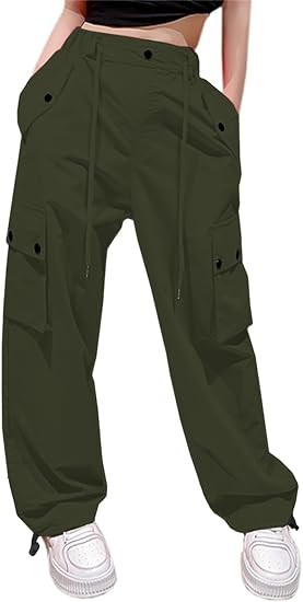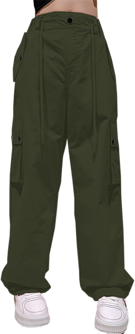 Girls&Womens High Waist Parachute Pants Y2K Cargo Trousers with Pockets 6 Years-Women 2XL