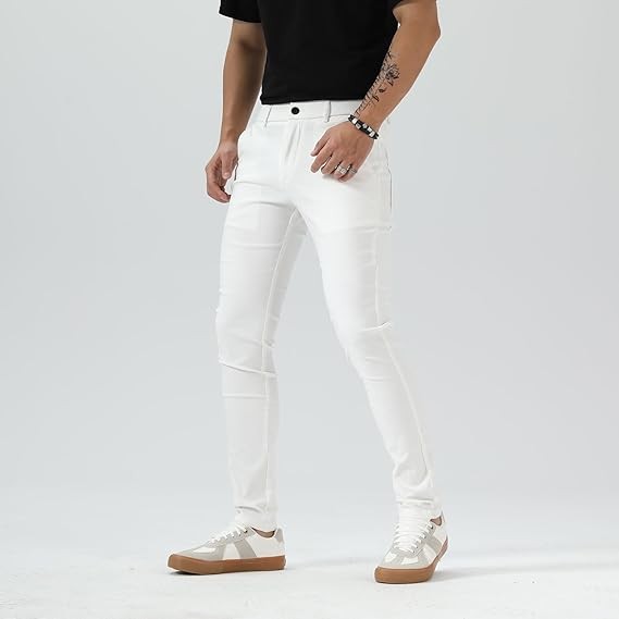 Skinny fit through hip and thigh, these plaid pants for men sit at the natural waist; the innovative mens plaid dress pants bring younger looking. ALL-DAY COMFORT. Made from a nylon &viscose blend with added spandex that moves with you for all day comfort. Throw together an effortless look with these skinny pants for men. With these mens skinny dress pants, we make looking great incredibly easy. Keep it casual and stylish as you step out wearing the mens skinny pants, these men's skinny dress pants can keep you comfort all day. Whether you step into the office or step out on the weekend, our men's skinny chinos fit your needs perfectly. Thank to the TR fabric with flex, even they are Skinny fit, you can still move and walk freely wearing these mens fashion pants. And these fashion pants for men bring a sleek silhouette. Pinstripe pants for who want a more modern feel with the refined extra slim fit, the style it's good for dress up and dress down.