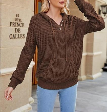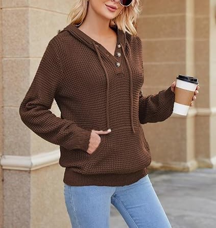 For an oversized look, choose your normal size; for a fitted look, choose one size smaller. Please consult the size chart before placing your order to ensure the best fit. Model is wearing size S and is 5'9'' tall, BWH: 33.8'', 24.8'', 36.2''. S=4-6, M=8-10, L=12-14, XL=16-18. Fall Oversized Hoodies: Wear this cozy trendy sweater hoodie with three buttons that you can open or close as needed. The cuffs and hem are designed with elastic ribbed patterns, adding a sense of fashion and fit. Knitted Long Sleeve Sweatshirts: Comfy drawstring hoodie with a kangaroo pocket is a classic design that gives you a casual style. It is also convenient to carry things like phone or keys and keep your hands warm.