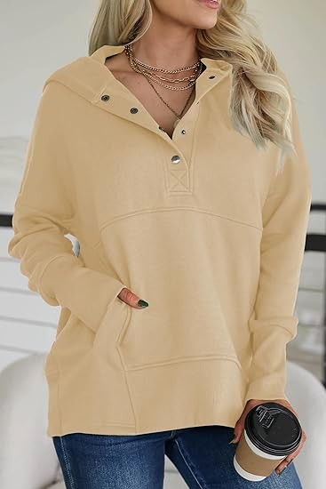 Women Casual Long Sleeve Hoodie Oversized Button Collar V Neck Sweatshirt Trendy Pullover Tops With Pockets Fashion 2024