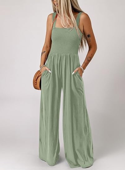 Feature: One Piece Sleeveless Jumpsuits, Square Neck, Wide Leg Pants, Two Side Pockets, Solid Color, Stretchable Long Pants Jumpsuit, Loose Fit, Casual Style.