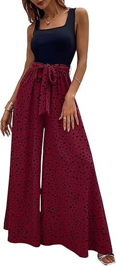 Material:Polyester and spandex.Well made,comfortable fabric.Casual comfy as pajama pants,lightweight and breathable. Design:Dalmatian print,colorblock,sleeveless,square neck,wide leg,empire waist,tank top jumpsuit,with belt,loose and casual style will be your best choice in summer! Occasion:The tank top jumpsuits for women are perfect for spring,summer,fall,going out,beach,vacation,shopping,homeware,date,yoga,party,club,garden party,wedding,cocktail,honeymoon,work,any outdoor or indoor activities. Match:You can pair this color block wide leg pants with variety of shirts,blouses,tunics,sandals,sneakers or heels to complete casual look that's easy to love all season long to show your curves and flatter your body.