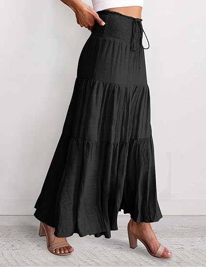 Women's Summer Flowy Boho Maxi Skirt Trendy Drawstring Elastic High Waist Pleated Tiered A Line Beach Long Skirts