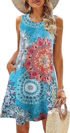 Feature: Summer Dresses for women comes with colorful floral print, round neck casual style,sleeveless,two side pockets which were deep enough to put into cards or lipsticks,Boho style, Swing Hem, sundresses;The bright Colorful print looks shine in summer Occations: T shirt dress is comfy enough to wear around the house as house dresses,work dress for women office,shopping,walking,and wear it to a casual evening out for graduation party,travel,beach wear Season: sun dress for women is above the knees and long enough that you wouldn't need to wear leggings with it if you didn't want.Boho dresses suit for summer or you can also collocate a coat in spring, autumn or winter Match: Cute tank dress great with jewelry,sandals,heels,flip flops or even sneakers.Casual loose swing dress also can look sexy if you pair it with a belt for a night out and paired with a pair of boots will make you looks great.