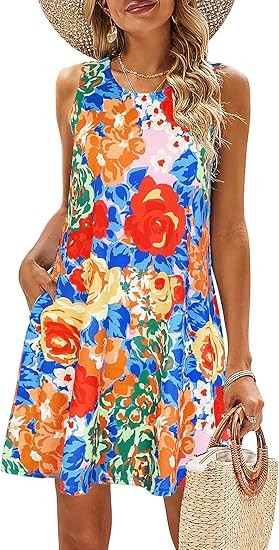 Feature: Summer Dresses for women comes with colorful floral print, round neck casual style,sleeveless,two side pockets which were deep enough to put into cards or lipsticks,Boho style, Swing Hem, sundresses;The bright Colorful print looks shine in summer Occations: T shirt dress is comfy enough to wear around the house as house dresses,work dress for women office,shopping,walking,and wear it to a casual evening out for graduation party,travel,beach wear Season: sun dress for women is above the knees and long enough that you wouldn't need to wear leggings with it if you didn't want.Boho dresses suit for summer or you can also collocate a coat in spring, autumn or winter Match: Cute tank dress great with jewelry,sandals,heels,flip flops or even sneakers.Casual loose swing dress also can look sexy if you pair it with a belt for a night out and paired with a pair of boots will make you looks great.