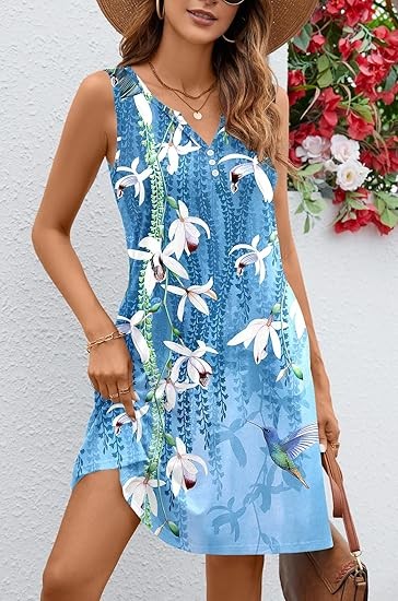 Material: 95%Polyester,5%Spandex.Skin-Friendly,Breathable,Nice and more of a soft stretchy feel.Not see through,Not shrinkage,Lightweight,Ideal for summer weather. Features:This dress features a V-neck,Sleeveless,Floral Print design.The A-line silhouette flatters all body shapes.Ideal for vacation or everyday wear,Is a must-have for the fashion-forward woman. Occasion: Whether you're heading to the beach,A dinner out,Or a casual day of shopping,This dress is versatile enough to suit any occasion.Pair it with sandals for a laid-back look or dress it up with heels and accessories for a more polished ensemble. Attention:Machine or hand wash with cold water/Hang or line dry/No bleach. Please forgive the slight color difference caused by different computer and mobile phone monitor settings.