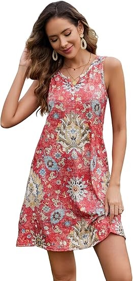 Material: 95%Polyester,5%Spandex.Skin-Friendly,Breathable,Nice and more of a soft stretchy feel.Not see through,Not shrinkage,Lightweight,Ideal for summer weather. Features:This dress features a V-neck,Sleeveless,Floral Print design.The A-line silhouette flatters all body shapes.Ideal for vacation or everyday wear,Is a must-have for the fashion-forward woman. Occasion: Whether you're heading to the beach,A dinner out,Or a casual day of shopping,This dress is versatile enough to suit any occasion.Pair it with sandals for a laid-back look or dress it up with heels and accessories for a more polished ensemble. Attention:Machine or hand wash with cold water/Hang or line dry/No bleach. Please forgive the slight color difference caused by different computer and mobile phone monitor settings.