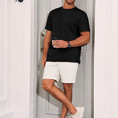 Features: Lightweight pocket tees for men, jacquard textured pattern, crew neck, ribbed neckline, short sleeve, single pocket at chest, loose fit, fashionable oversized men's t-shirt