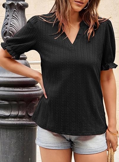 Womens Summer Short Puff Sleeves Blouses Shirts V Neck Cute Solid Knit Textured Casual Regular Fit Tops