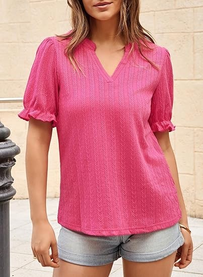 Womens Summer Short Puff Sleeves Blouses Shirts V Neck Cute Solid Knit Textured Casual Regular Fit Tops