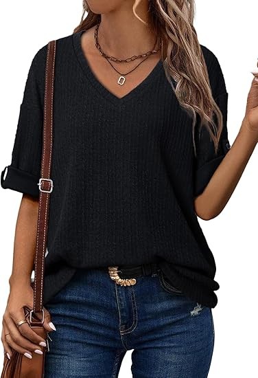 Women's Tops Dressy Casual V Neck Short Sleeve Rolled Hem Loose Blouses T Shirts