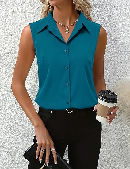 Quality Sleeveless Tops - Crafted from premium fabric 92% polyester and 8%Spandex, soft to the touch, lightweight and comfortable Classic Collared Shirts - Spread collar, button-up front closure, curved hem, clean chest-cut design for adding effortless enhancement to your silhouette and bringing business professional polish to any outfit Versatile Button Down - You can dress down with jeans, shorts,denims for relaxed yet polished casual look or dress up with skirts, slacks or dress pants for a dressy and professional look. Tuck for dressy casual look while untuck for a more business casual look